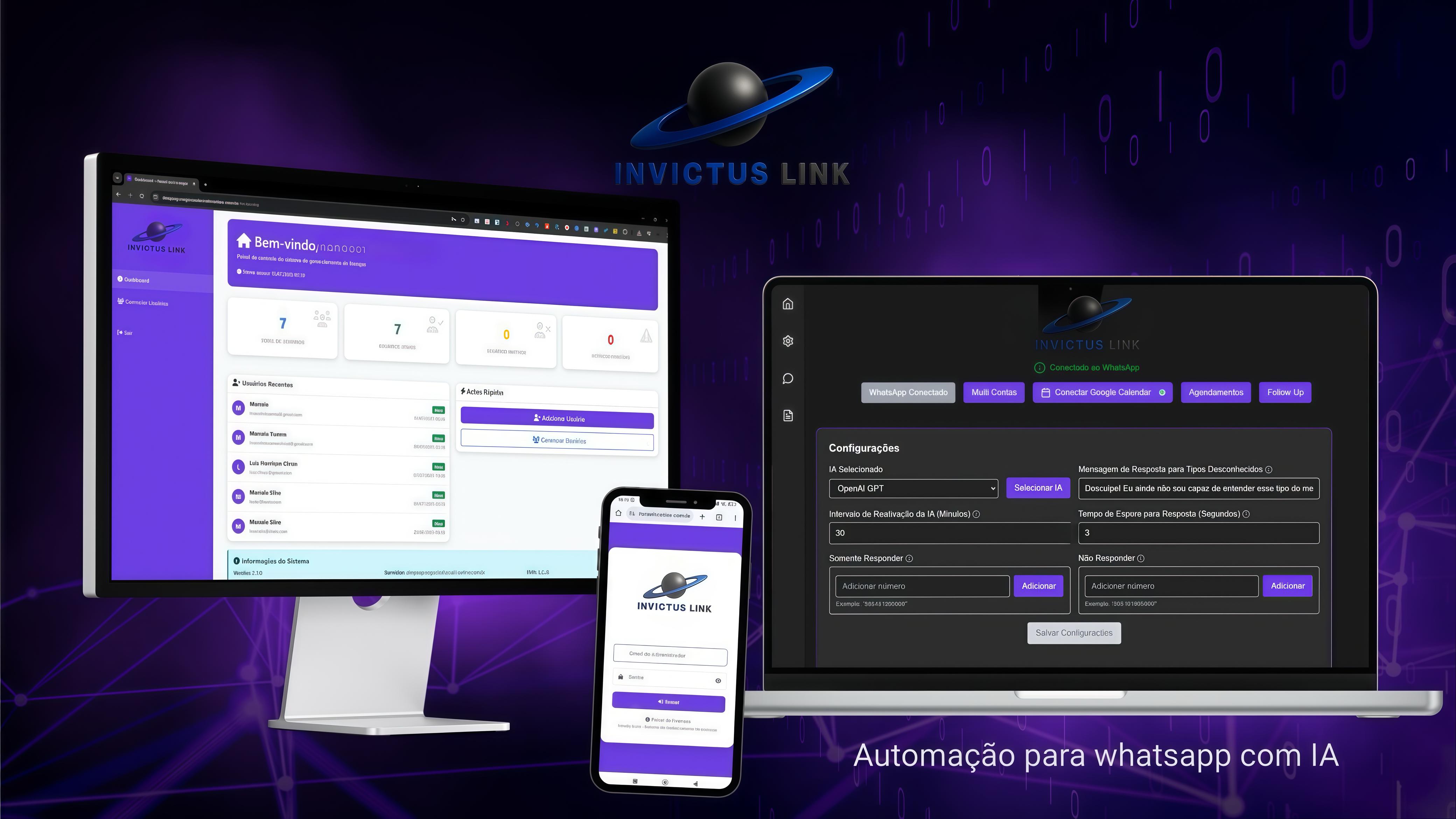 Apresentamos o Invictus IA, o software revolucionário da Invictus Link que automatiza o atendimento e as vendas via WhatsApp, operando 24 horas por dia, 7 dias por semana.